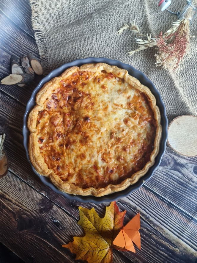 Disposer la pâte dans un plat, piquer la pâte à la fourchette et verser les légumes dessus.