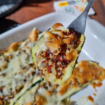 Incorporer la chair des courgettes, ajouter le quinoa, le bouillon de volaille et arroser le tout avec 300 ml d’eau.